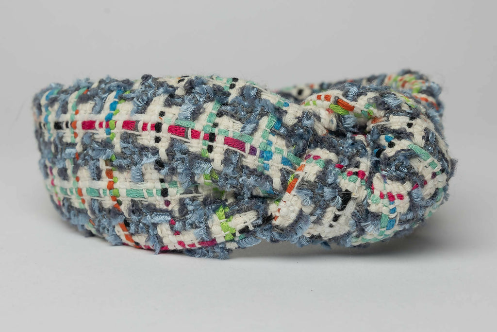 This blue headband adds color and dimension to your look. The handmade headband features soft textured detailing with subtle multicolored threads that create a stylish, elevated finish.