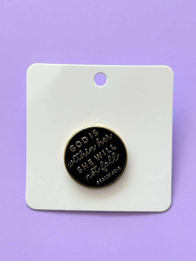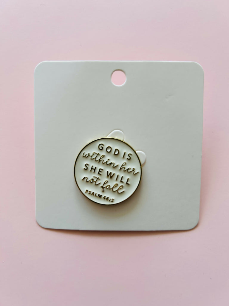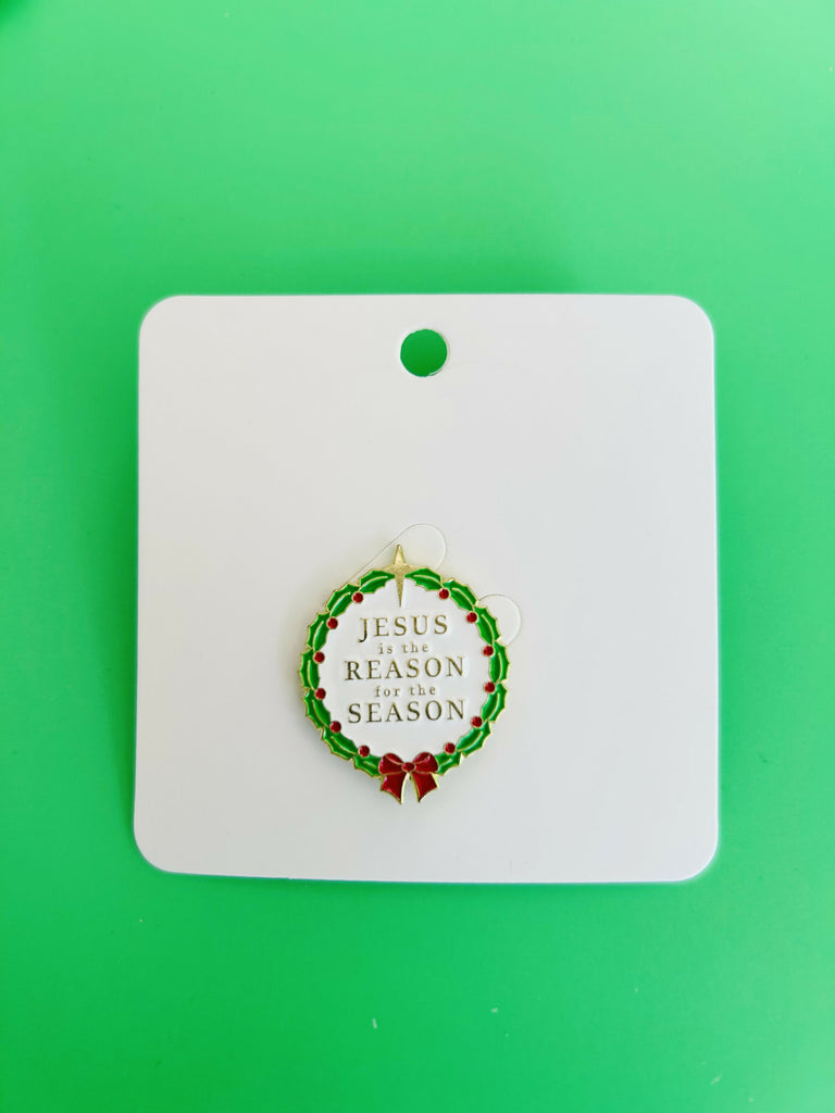 Metal styles - God is Within Her (both black and white pins), Jesus Is The Reason For The Season