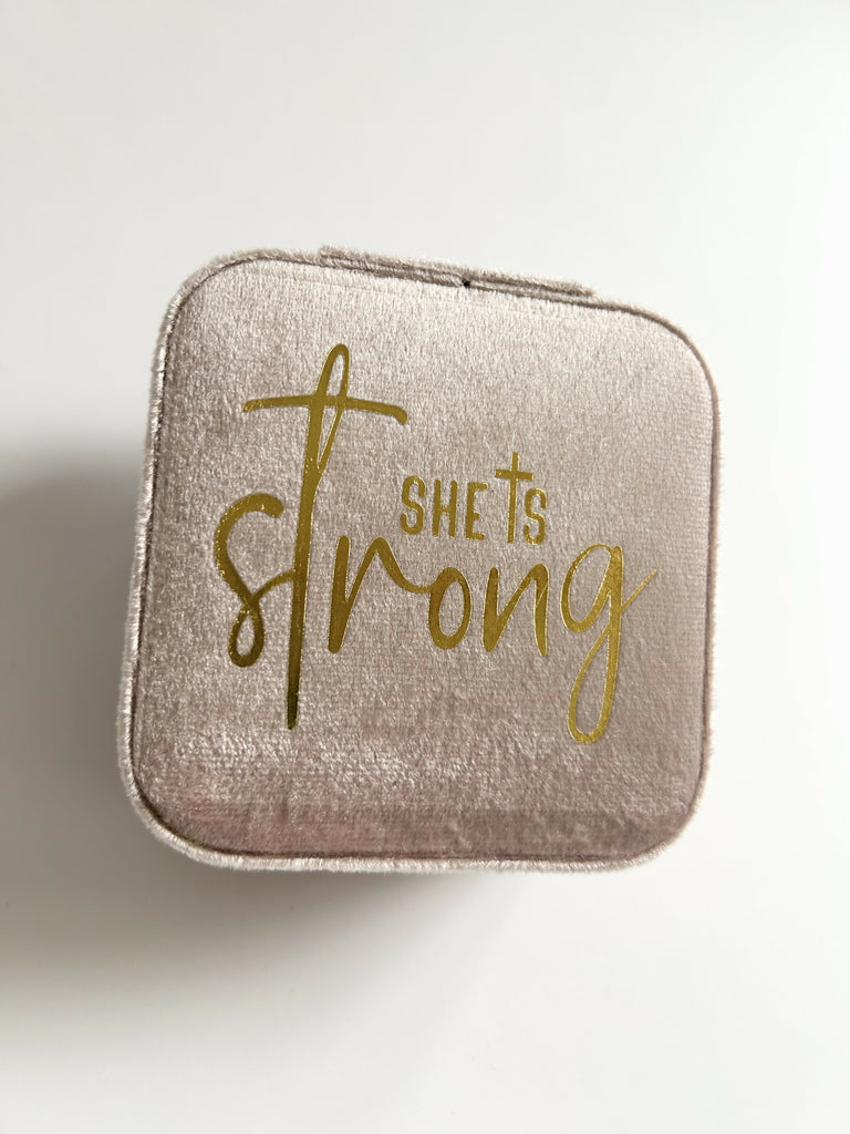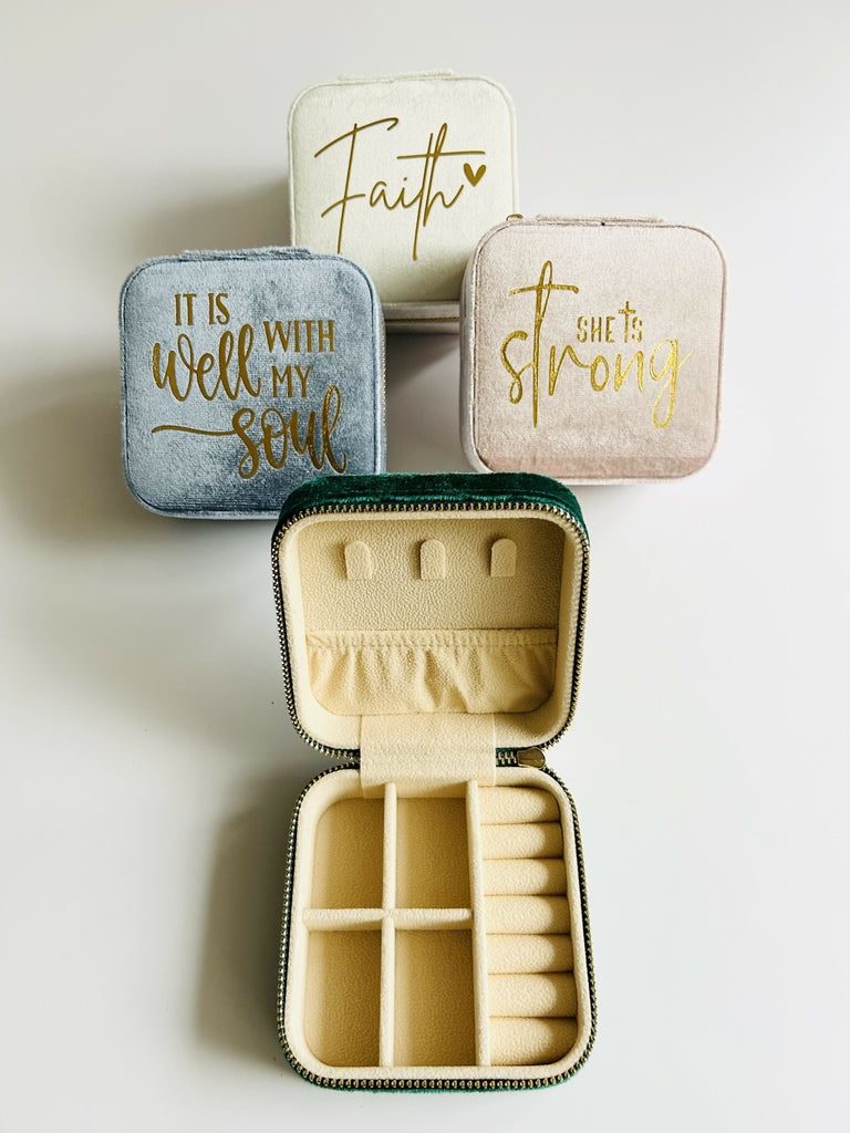 These faith jewellery boxes come in 4 colours (green, blue, pink and white). Each box is created with plush velvet and accented with gold zippers and powerful statements.