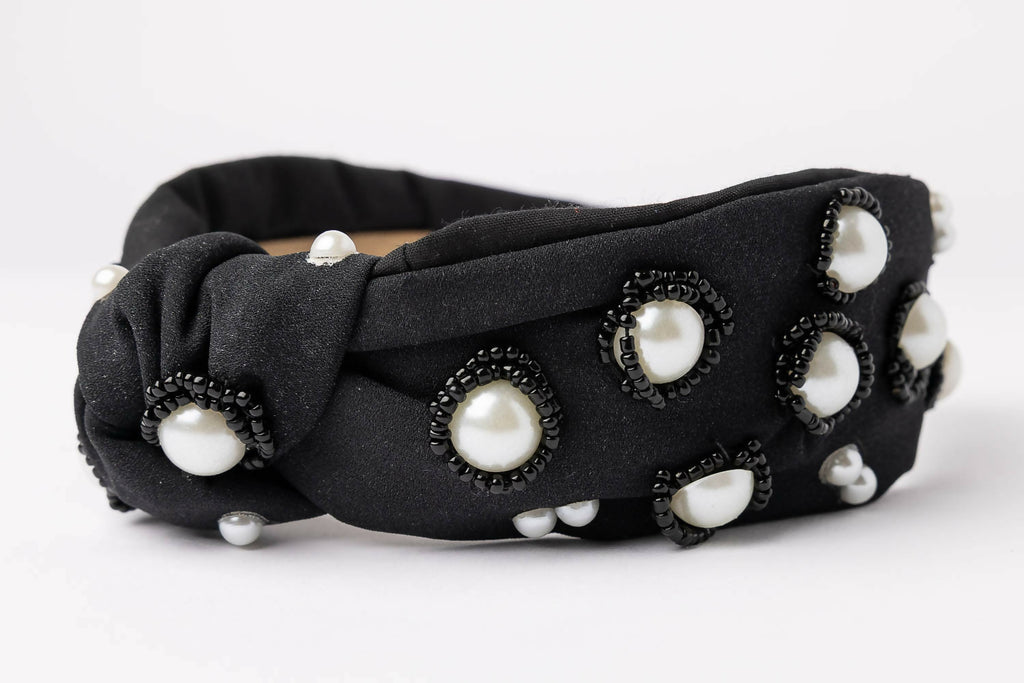 This black pearl headband is finished with faux pearls and black beadwork for a bold, polished look.