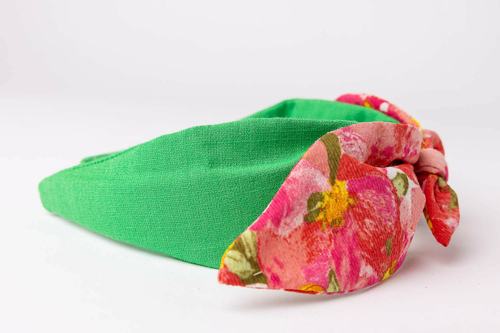 Green headband for women with a bright pink floral tie detail for a fresh, eye-catching look.