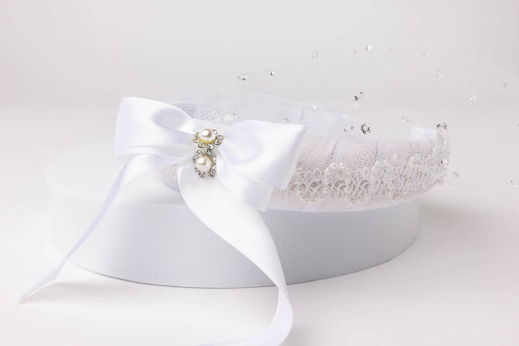 This one-of-a-kind white girls' headband features a satin bow, faux pearl and rhinestone detail, delicate beaded trim, and a soft tulle veil accent for an elegant finish.