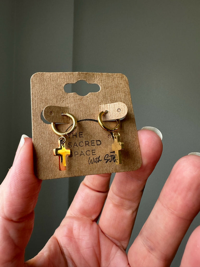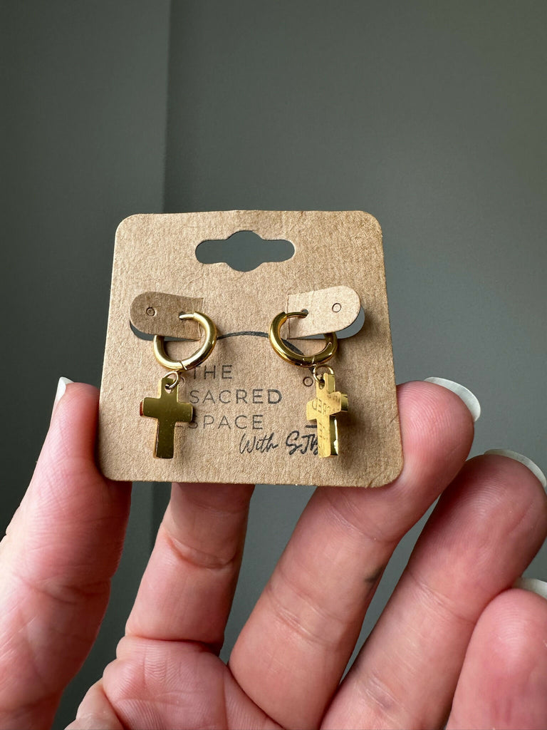 These 18k gold PVD coated stainless steel hoops (12mm) are adorned with 13mm cross charms.
