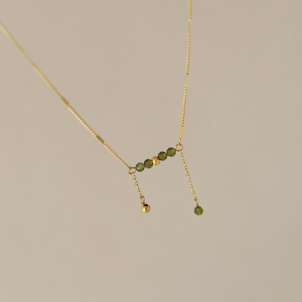 A Waterproof delicate trail of green beads and gold drops drapes like a playful vine, bringing a touch of nature’s whimsy to your neckline.