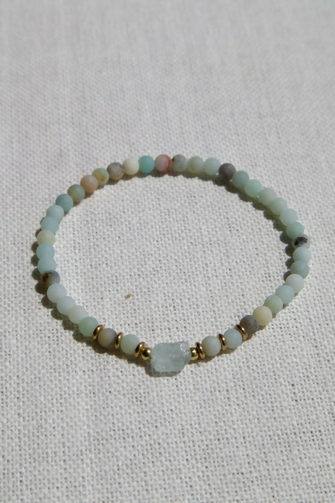 This genuine gemstone bracelet features a raw aquamarine stone surrounded with 18k gold PVD coated stainless steel beads and matte amazonite beads. It is 7”.