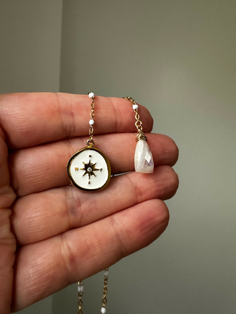 This lux bookmark features a gold plated, enamel compass charm (22mm) and a moonstone pendant (18mm).