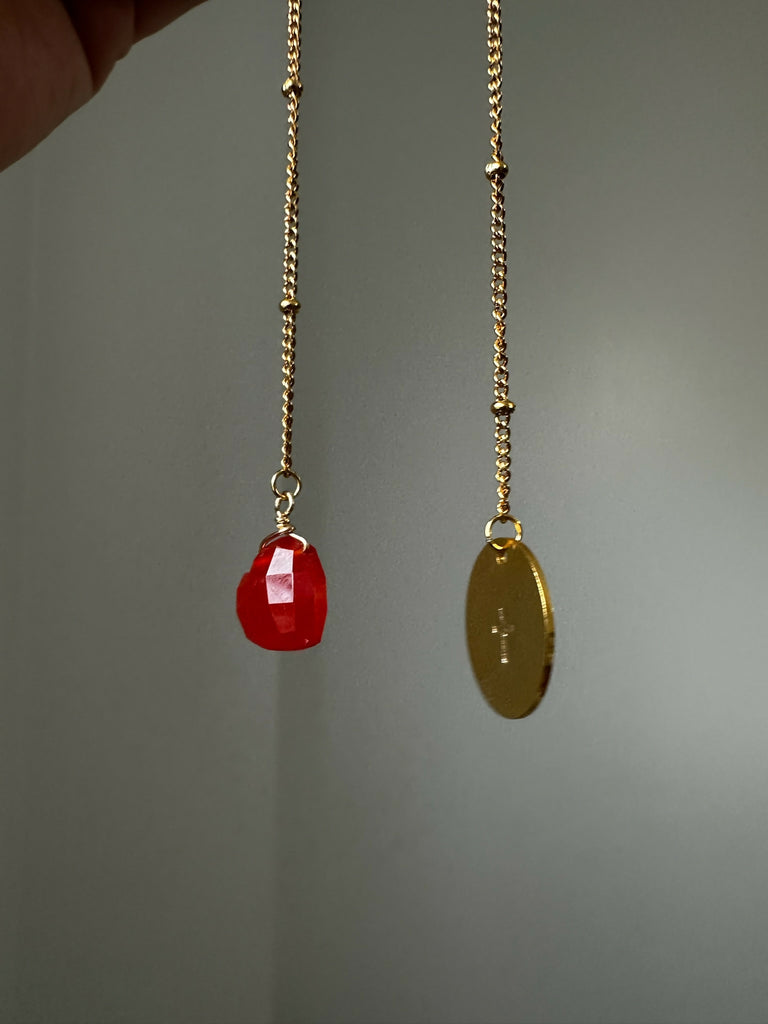 This bookmark features a sweet heart charm carved from genuine carnelian gemstone (11mm), a 16mm cross stamped coin and 18k gold covered dew drops chain.