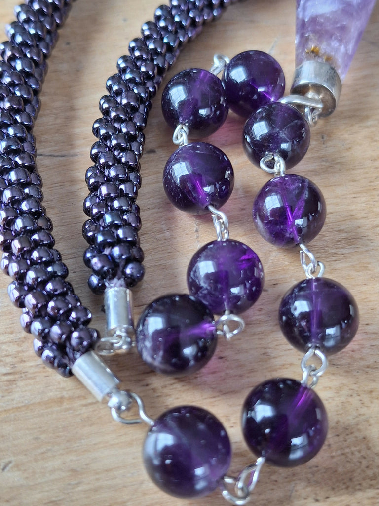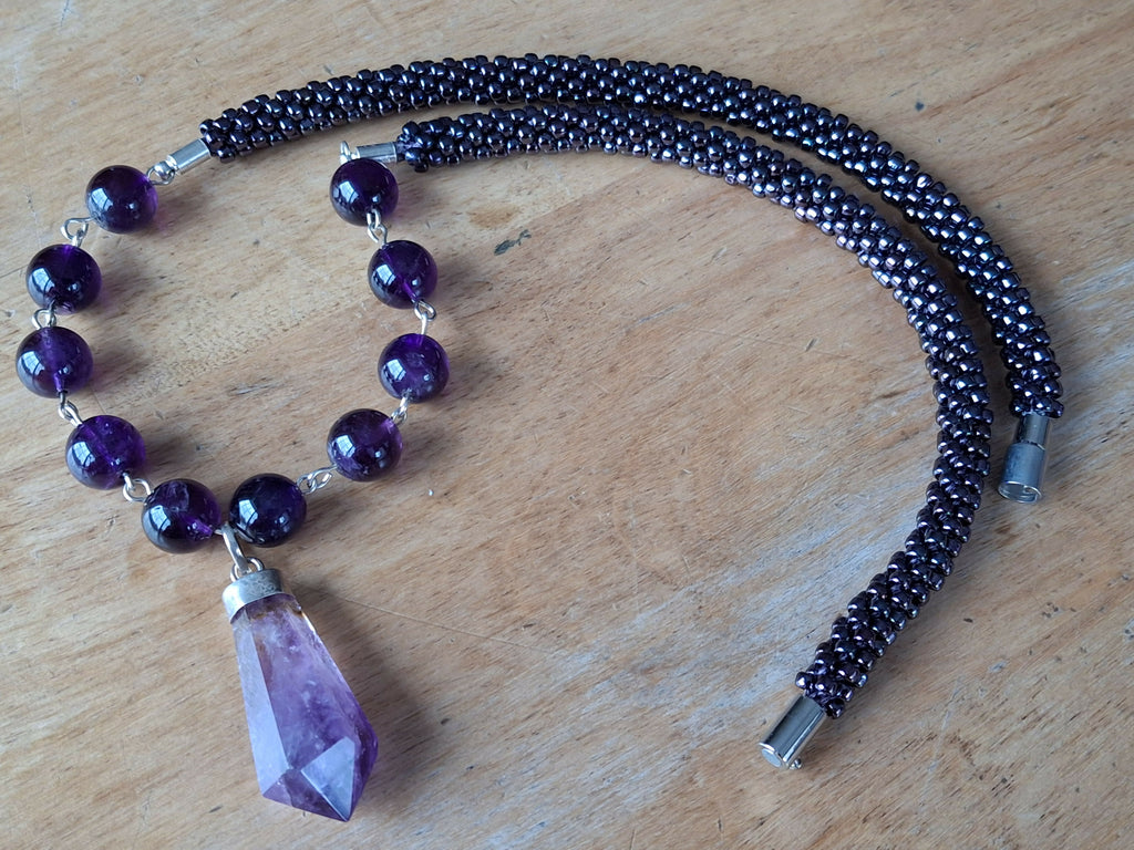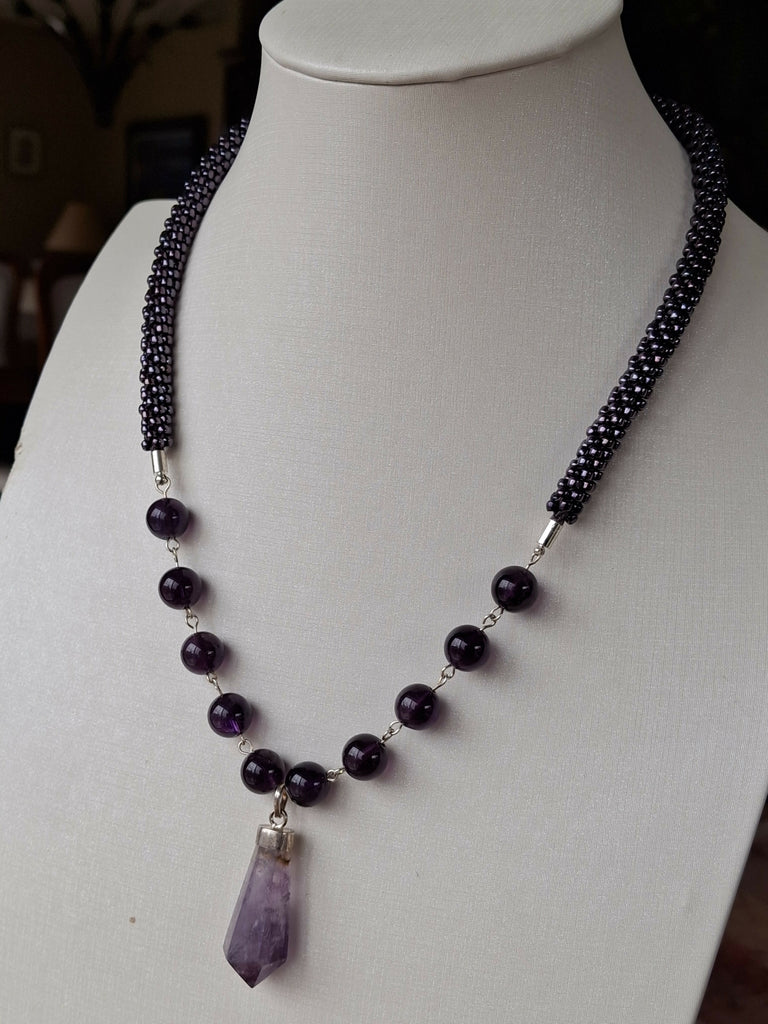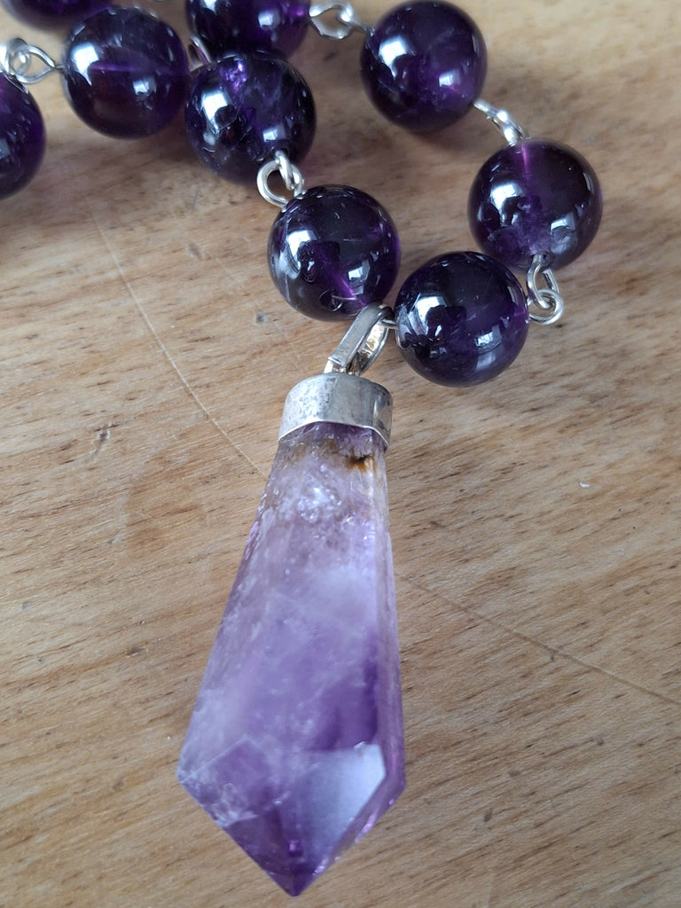 Features a vintage amethyst crystal pendant and 10 8mm amethyst beads.