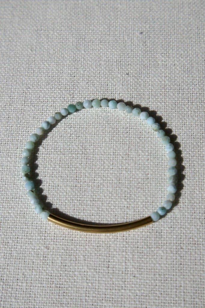This stunning larimar bracelet features an 18k gold PVD coated stainless steel bar and is 7”.
